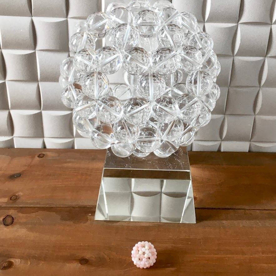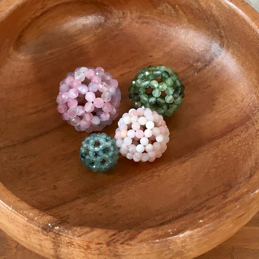 ・一つひとつ天然石で手作りで製作していますので、フラーレンにも個性がでてきます。最終的に固く編みあがったものもあれば緩めのものもありますし、天然石も、色の濃い薄いや、多少の形のずれがあるものもあります。あまりに形が崩れるもの以外はフラーレンとして問題ありませんので、どうか個性として捉えられて、自分の手元に来た子を唯一無二の存在として大切にしていただけると幸いです