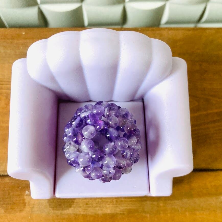 ストライプアメジストとは、アメジストとクリスタル(白水晶)が混ざりあい、天然のストライプ模様になっているアメジストのことです。こちらは 小粒のためストライプになりきらないものもあり、全体的にそれほど縞々感は強くないのですが、粒によってストライプがはっきりと見られます。